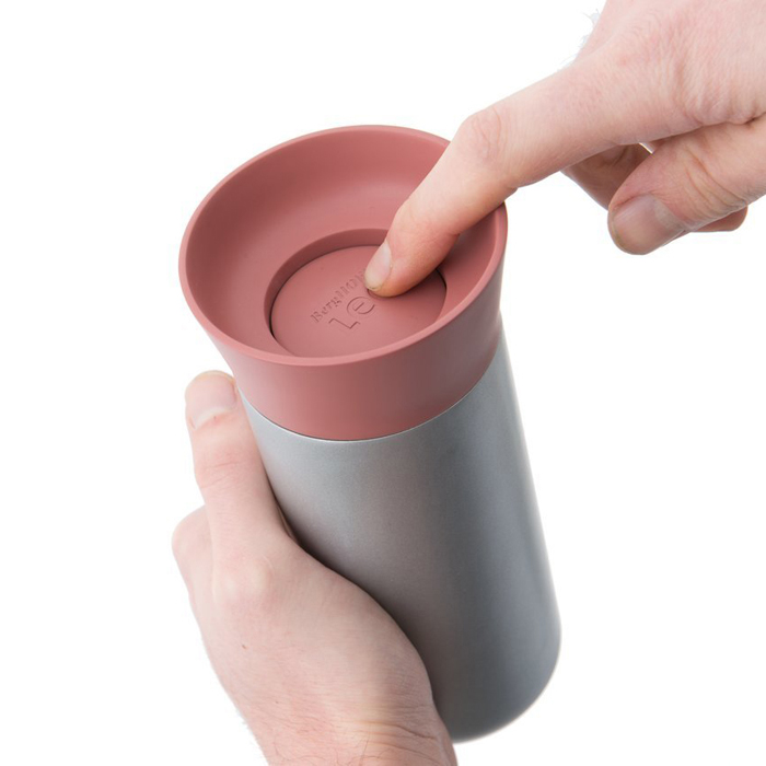 Термокружка виготовлена з нержавіючої сталі, має ергономічний дизайн. Кришка з силіконовим ущільнювачем має високі бортики, кнопковий механізм для зручного відкривання. Рекомендується мити вручну.