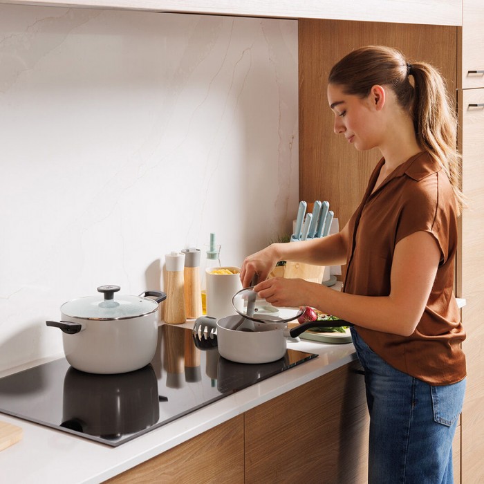 Особливості: корпус з алюмінію забезпечує швидке нагрівання та рівномірний розподіл тепла, полегшуючи приготування та догляд за посудом; 100% екологічне та безпечне для здоров'я керамічне антипригарне покриття CeraGreen, яке дозволяє смажити практично без олії (не містить PFAS); кришки виготовлені з термостійкого скла, мають отвори для виходу пари; фенольні ручки для комфортного утримання та безпеки; 2-х шарове цільнодискове дно; продуманий дизайн корпусу підвищує робочу поверхню на 25%; завдяки скляним кришкам можна стежити за приготуванням страв; підходять для всіх типів плит, включаючи індукційні; підходять для духовки; температурна стійкість до 180°C; легко очищаються