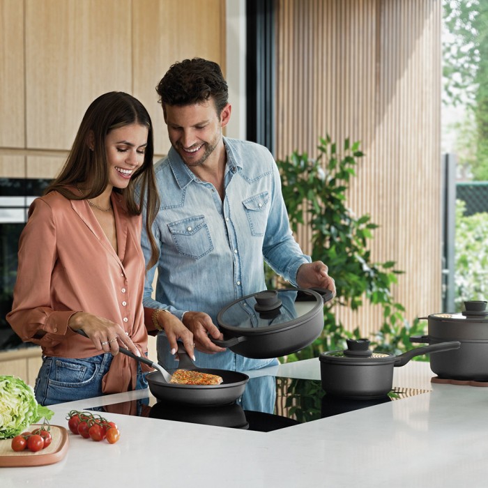Особливості: корпус з литого алюмінію продовжує термін служби сковороди, забезпечує швидке нагрівання та рівномірний розподіл тепла, полегшуючи приготування та догляд за посудом; антипригарне покриття Ferno Green не містить ПФОК, свинець та кадмій; фенольна ручка з силіконовою вставкою для зручного м'якого утримання та безпеки; 2-х шарове цільнодискове дно; у ручці отвір для вертикального зберігання; підходить для всіх типів плит, включаючи індукційні; не підходить для духовки