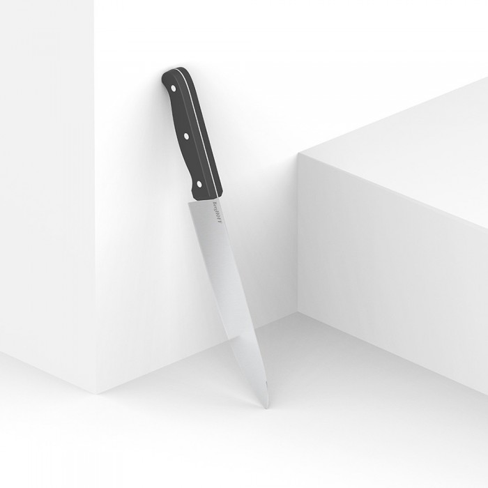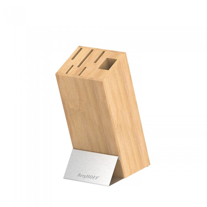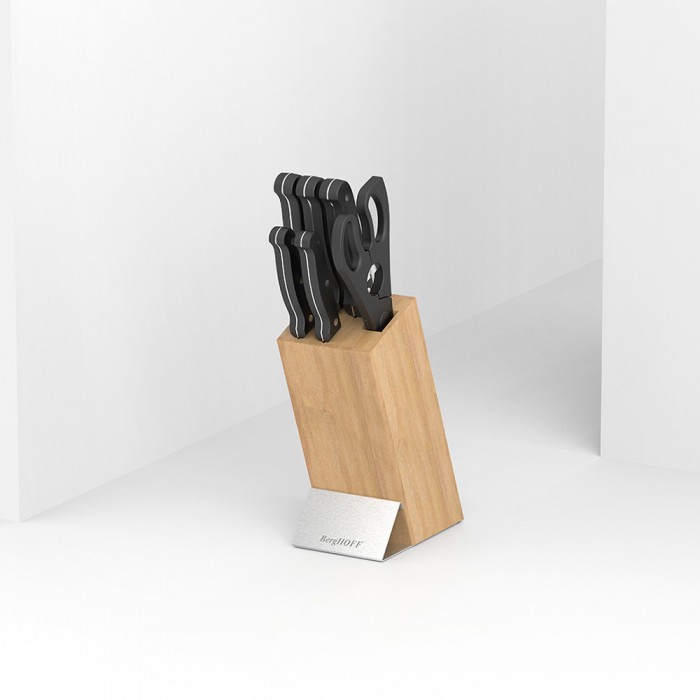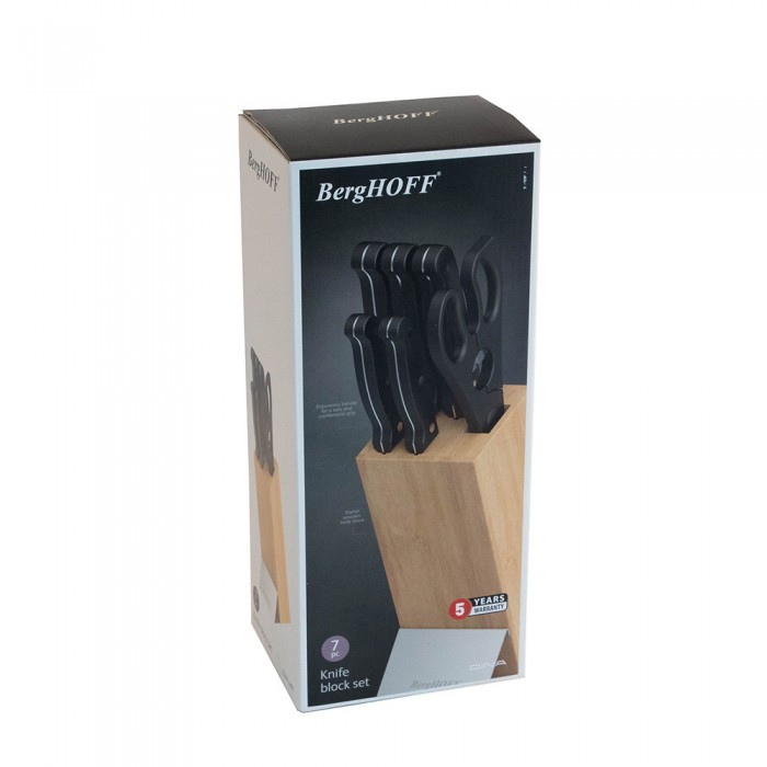Особливості: набір ножів ідеально підходить для нарізки, шаткування та подрібнення м'яса, риби, птиці, випічки, овочів та фруктів; міцна бамбукова колода підходить для зберігання 5-ти ножів та ножиць; високоякісна нержавіюча сталь лез забезпечить гостроту заточування на тривалий час; ергономічні ручки з ABS пластику кріпляться до леза трьома заклепками, безпечні та комфортні в експлуатації; ножі ідеально збалансовані; набір підходить як для професійного, так і домашнього використання; легко очищаються