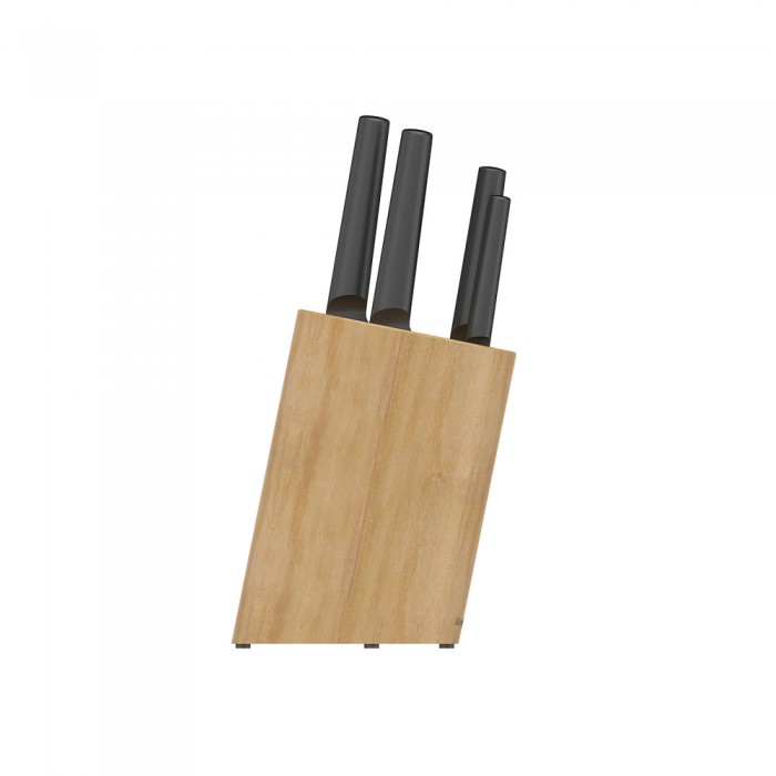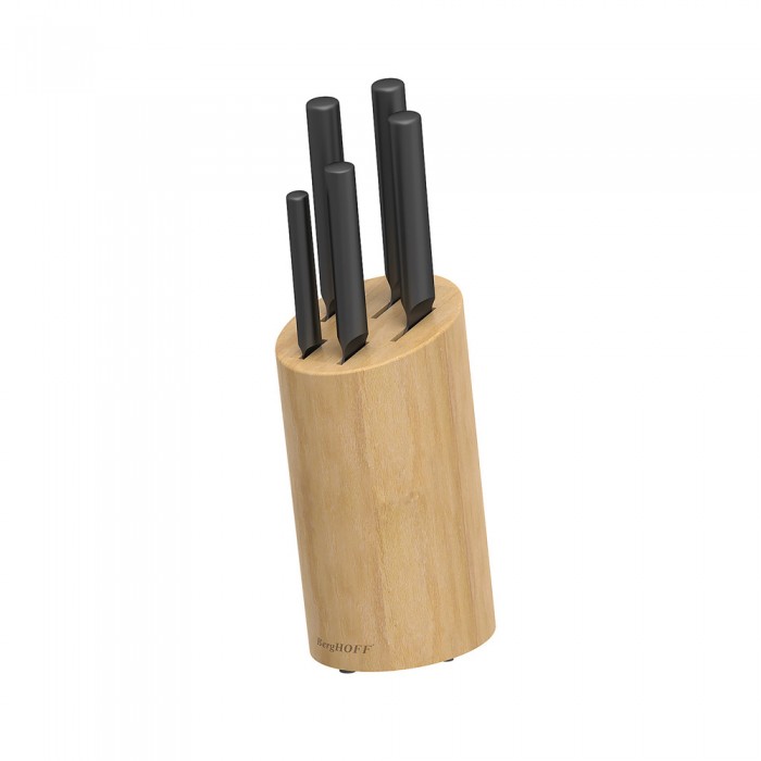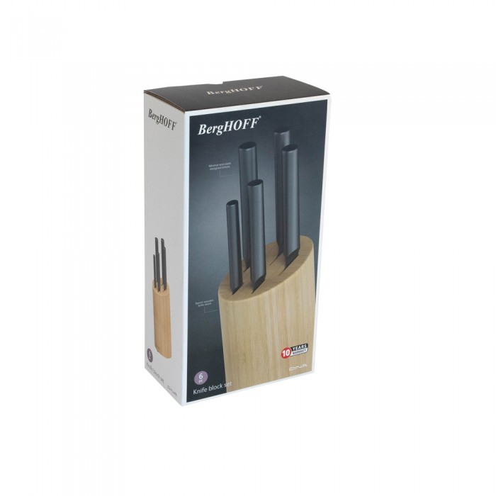 Особливості: набір ножів ідеально підходить для нарізки, шаткування та подрібнення м'яса, риби, птиці, випічки, овочів та фруктів; міцна бамбукова колода підходить для зберігання 5-ти ножів; високоякісна нержавіюча сталь та титанове покриття лез забезпечать гостроту заточування на тривалий час; порожнисті округлі ручки з нержавіючої сталі зручні та безпечні; безшовне з'єднання лез та рукоятки забезпечить додаткову гігієну; набір підходить як для професійного, так і для домашнього використання; легко очищаються