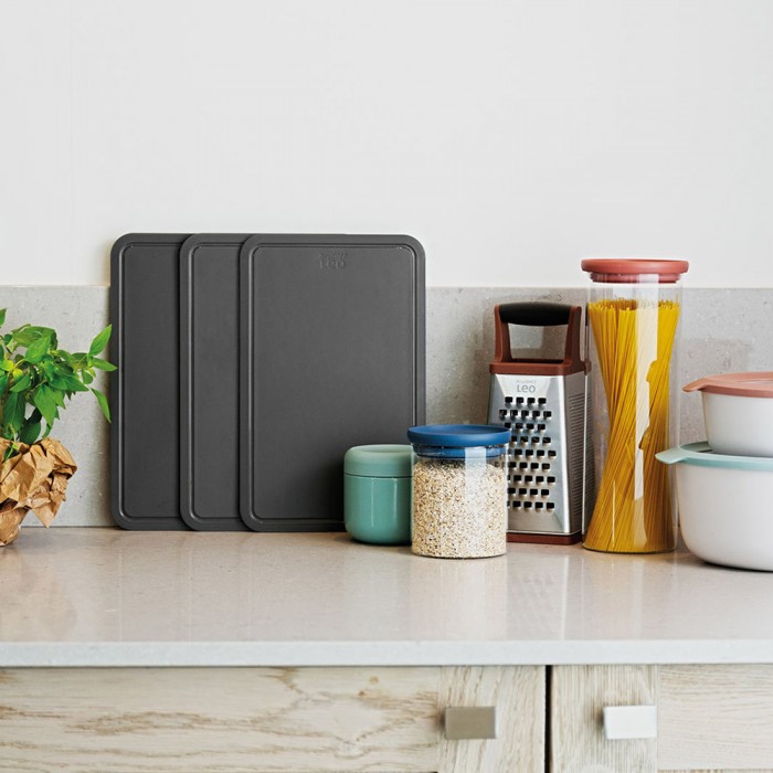 Особливості: безшовна конструкція ножів для додаткової гігієни; ергономічна, безпечна рукоятка; двоступінчаста точилка, що вбудована в колоду; неслизька основа колоди; 3 дошки у комплекті для нарізування різних продуктів; потужний магніт для розміщення ножиць
