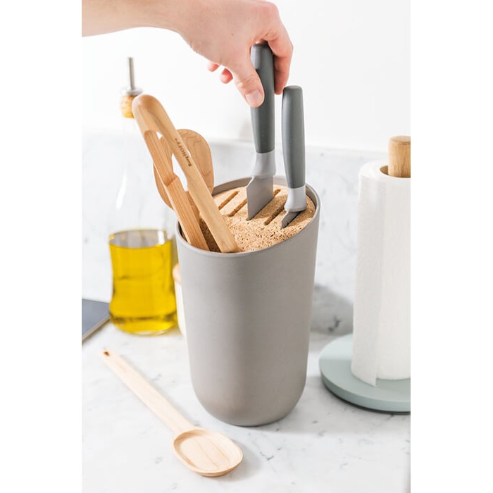 Підставка виготовлена з бамбукового волокна зі вставкою з коркового дерева. На перший погляд ця підставка - просто зручна приналежність. Але вона забезпечена вбудованою корковою вставкою, що дозволяє безпечно зберігати ножі та інші інструменти. Тепер все потрібне кухонне приладдя буде під рукою, займаючи мінімум місця. Рекомендується мити вручну.